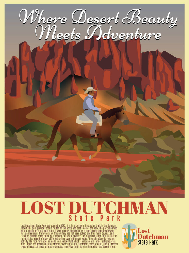This project focused on creating a poster and a series of logos for Arizona State Parks. I selected Kartchner Caverns State Park, Lost Dutchman State Park, and Slide Rock State Park for the logo series, with the poster centered on Lost Dutchman. For the logos, I wanted a brighter, more modern look than the park branding used at the time, while keeping the designs unified through consistent shapes and typography. I paired a serif headline with a sans serif subheading to create a balance between clarity and character, giving the designs a more inviting and distinctive feel. For the poster, I drew inspiration from classic national park posters by using rich colors and strong contrast, while keeping the rider on horseback as the main focal point. The most challenging part was simplifying the landscape while still preserving important details and recognizable shapes. This project taught me a great deal about logo development, especially how important it is for a design to clearly reflect the identity and purpose of what it represents.