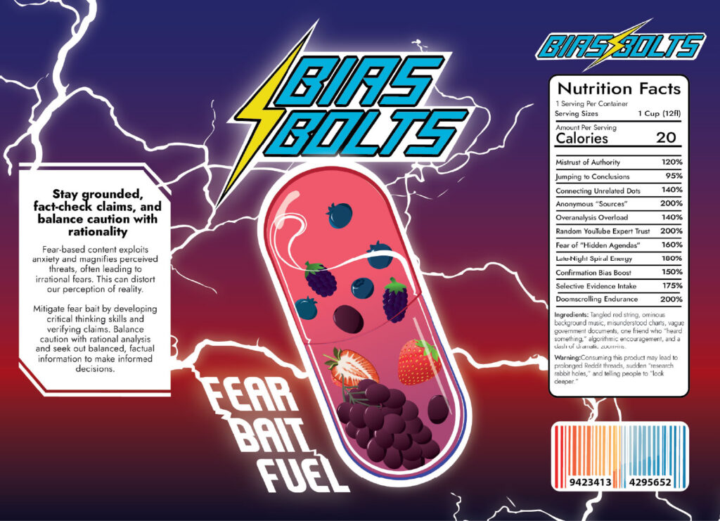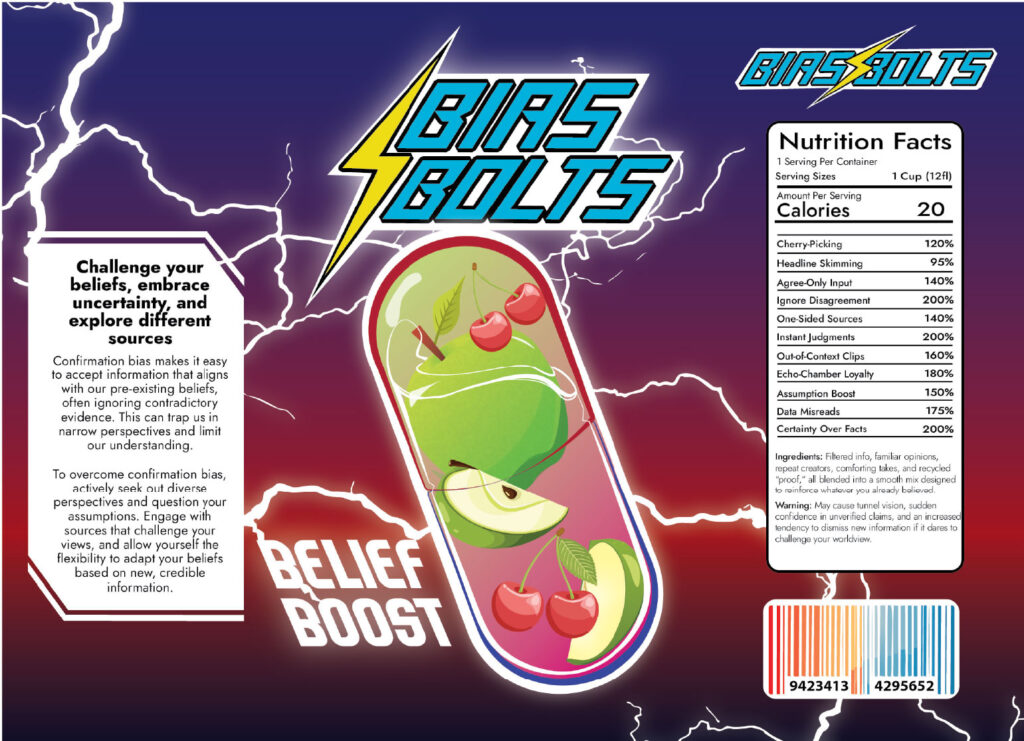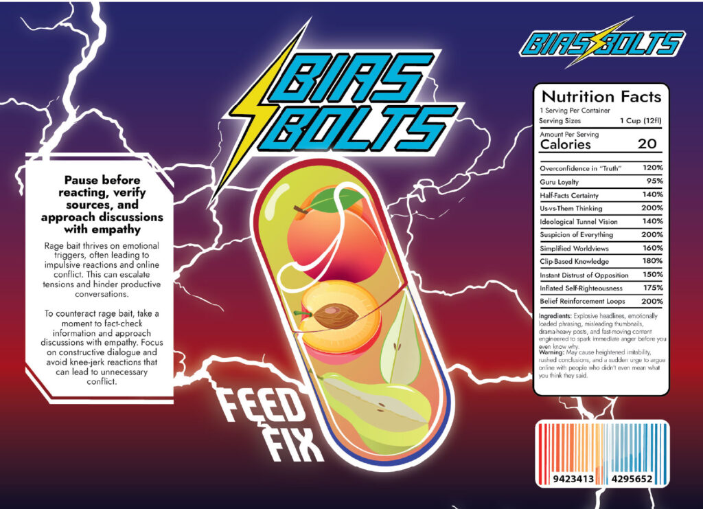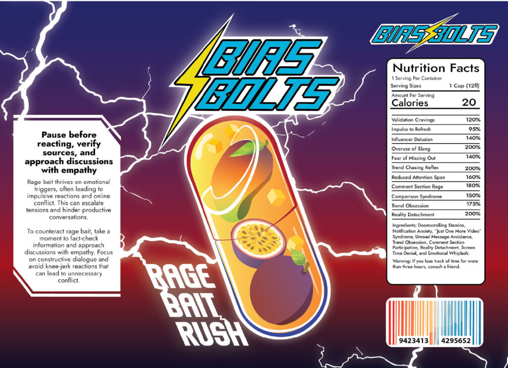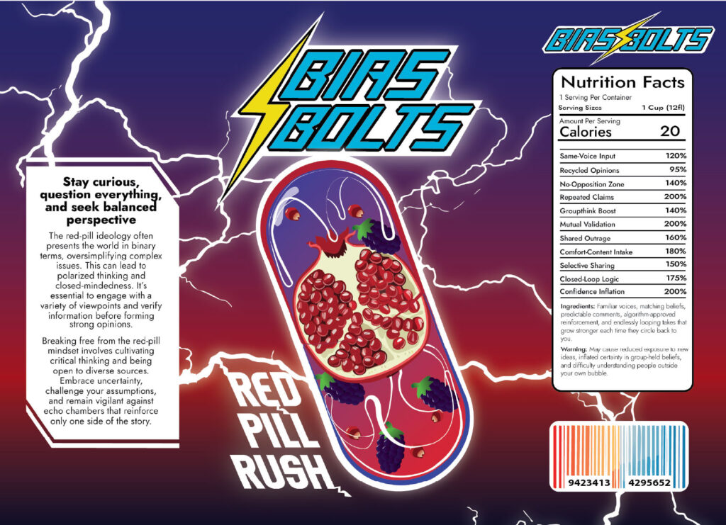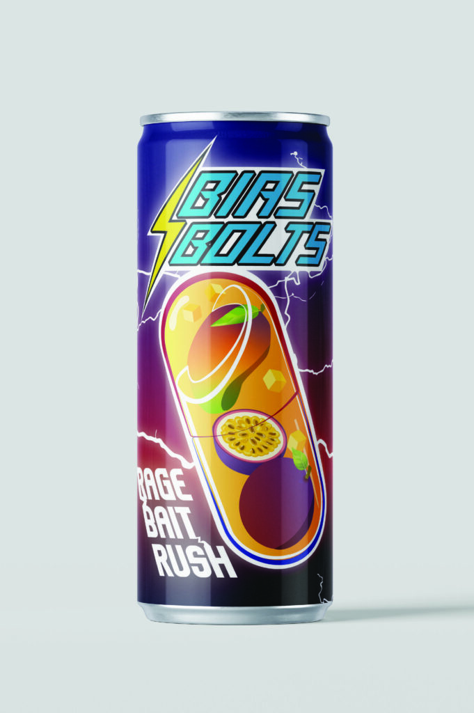 This project explores Cultivation Theory through the lens of online ideology, focusing on how repeated exposure to digital content shapes perceptions of reality. Using the Red Pill movement and the broader manosphere as a case study, the work examines how media environments cultivate beliefs about gender, power, and social identity through repetition, emotional reinforcement, and algorithm-driven visibility. Drawing from concepts such as Mean World Syndrome, mainstreaming, and resonance. The project investigates how online communities can normalize hostility, isolation, and perceived victimhood, particularly among young men navigating digital spaces. The final visual outcome uses a series of conceptual can designs titled Bias Bolts to represent six recurring mechanisms within these media cycles: Red Pill ideology, confirmation bias, echo chambers, rage bait, fear bait, and algorithmic reinforcement. Each design translates theoretical ideas into visual form, demonstrating how media messages can become both persuasive and habitual when repeatedly encountered. Overall, the project serves as both a study of cultivation theory in contemporary online culture and a reflection on the responsibility of visual media to reveal, question, and challenge the systems that shape public perception.