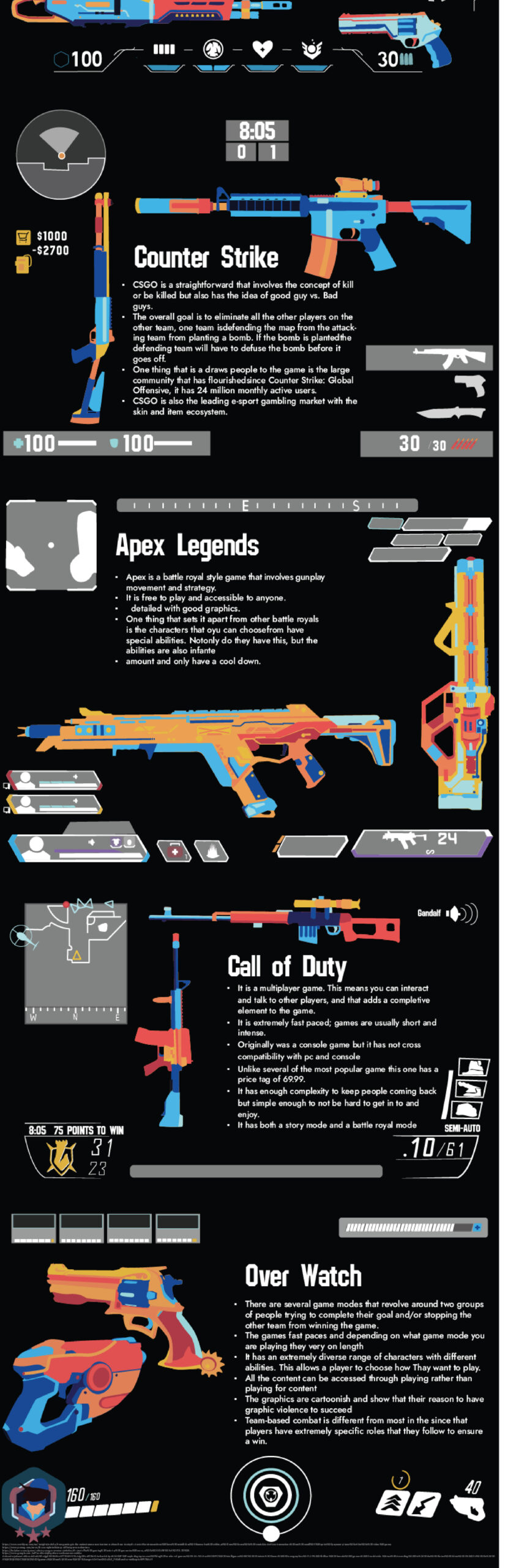 This project focused on creating an infographic about the history and growth of first-person shooter games, a subject I chose because I was playing a lot of FPS titles at the time and wanted to explore how the genre became so influential. The infographic traces the development of FPS games and highlights some of the most popular titles during that period, including Valorant, Counter-Strike, Apex Legends, Call of Duty, and Overwatch. Because this was one of the first infographics I created, it became an important learning experience in both layout and visual hierarchy. I focused on designing the composition so the viewer’s eye would naturally move down the page in a clear and engaging way while still keeping the information visually interesting. To help the graphics stand out against a dark background, I used warm oranges and cool blues to create contrast, depth, and layered visual energy throughout the piece. This project strengthened my confidence in Adobe Illustrator and helped me better understand how color, spacing, and illustration can work together to make complex information easier to follow.