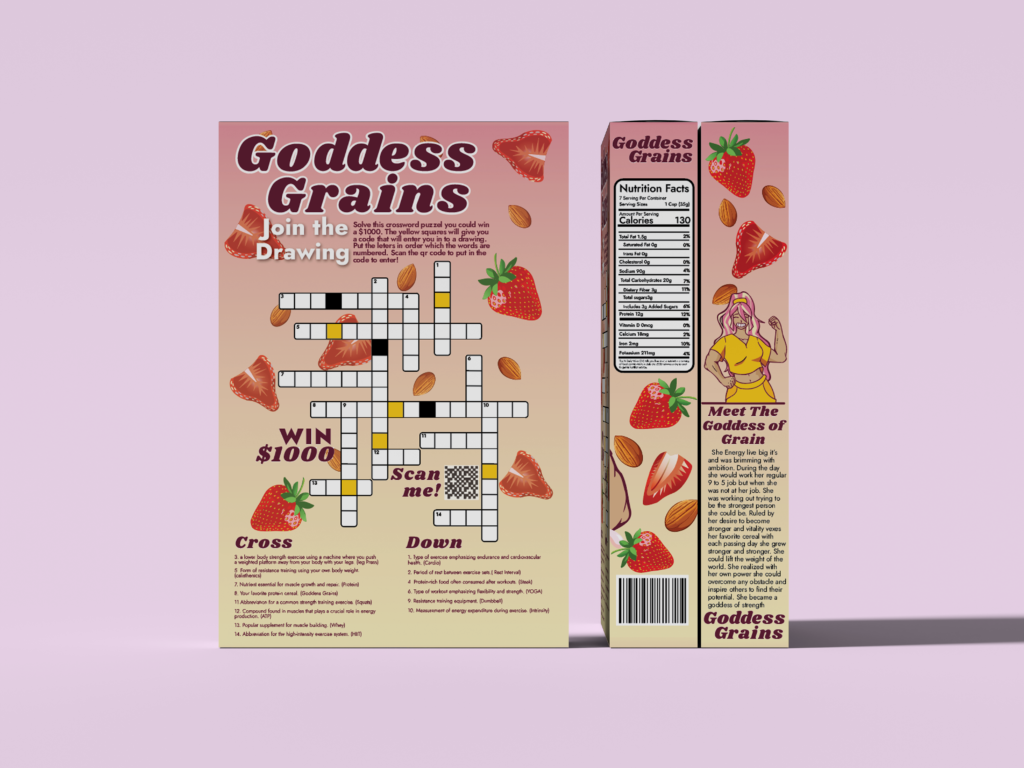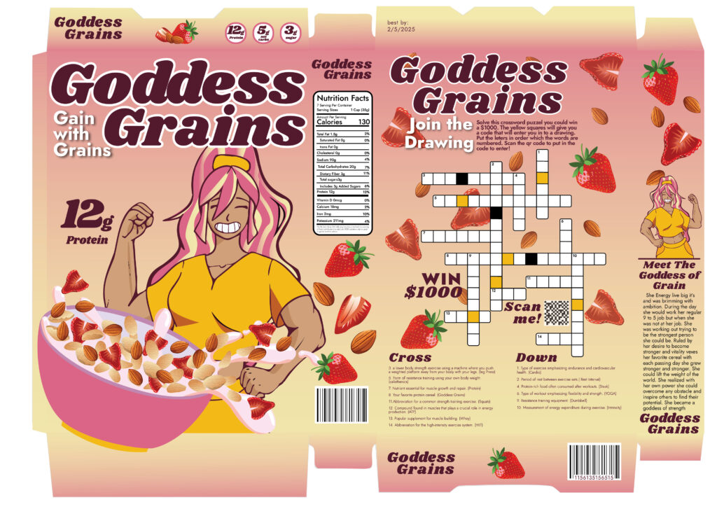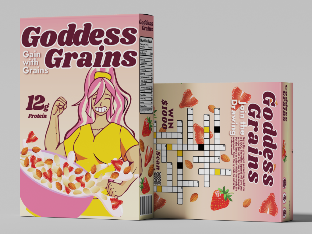 This project focused on creating an original cereal brand and full package design, including all of the elements found on a retail cereal box such as a mascot, headline, tagline, nutrition information, ingredients, barcode, expiration date, and a game on the back panel. My concept was a healthy cereal called Goddess Grains, designed for women who enjoy fitness and active lifestyles. I wanted the brand to feel strong, energetic, and playful, so I created a mascot of a muscular woman confidently showing her strength to reinforce the theme of empowerment. Because the entire project was built in Adobe Illustrator, one of the biggest challenges was illustrating realistic cereal flakes and fruit that looked believable while still fitting the overall design style. I reused these illustrations throughout the packaging to create consistency across all sides of the box. I also enjoyed developing the back-panel activity, although creating the crossword puzzle was challenging since it was my first time designing one and I wanted it to fit the workout-focused concept of the cereal. Through this project, I learned a great deal about package design, especially how many visual, informational, and structural details are required to make a product feel complete and shelf-ready.
