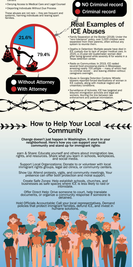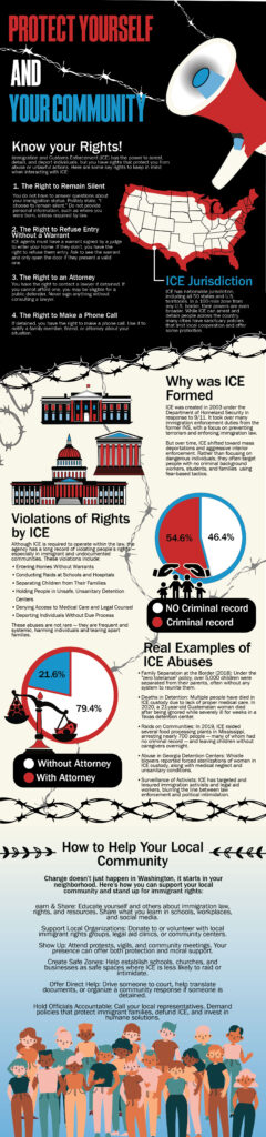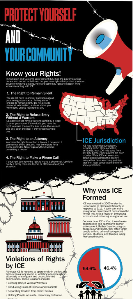 This project focused on creating an infographic about how communities can protect themselves and stay informed regarding interactions with U.S. Immigration and Customs Enforcement. My goal was to present important information in a way that people would be more willing to engage with visually, including statistics, common tactics that may be used during encounters, and practical guidance on what individuals should know in those situations. Because the topic is serious and emotionally heavy, I wanted the design to reflect that weight while still remaining clear and accessible. I used bright, high-contrast visuals against the background to draw attention, while also incorporating red, white, and blue tones to connect the subject to United States and its broader social context. At the bottom of the infographic, I included a section focused on ways people can support their local community, including actions and resources that may help improve safety and awareness for others. One of the biggest challenges was fitting a large amount of information into a limited layout without overwhelming the viewer, which made hierarchy and organization especially important. Through this project, I learned how visual design can make complex information easier to understand and how layout choices strongly affect whether a viewer stays engaged with difficult subject matter.